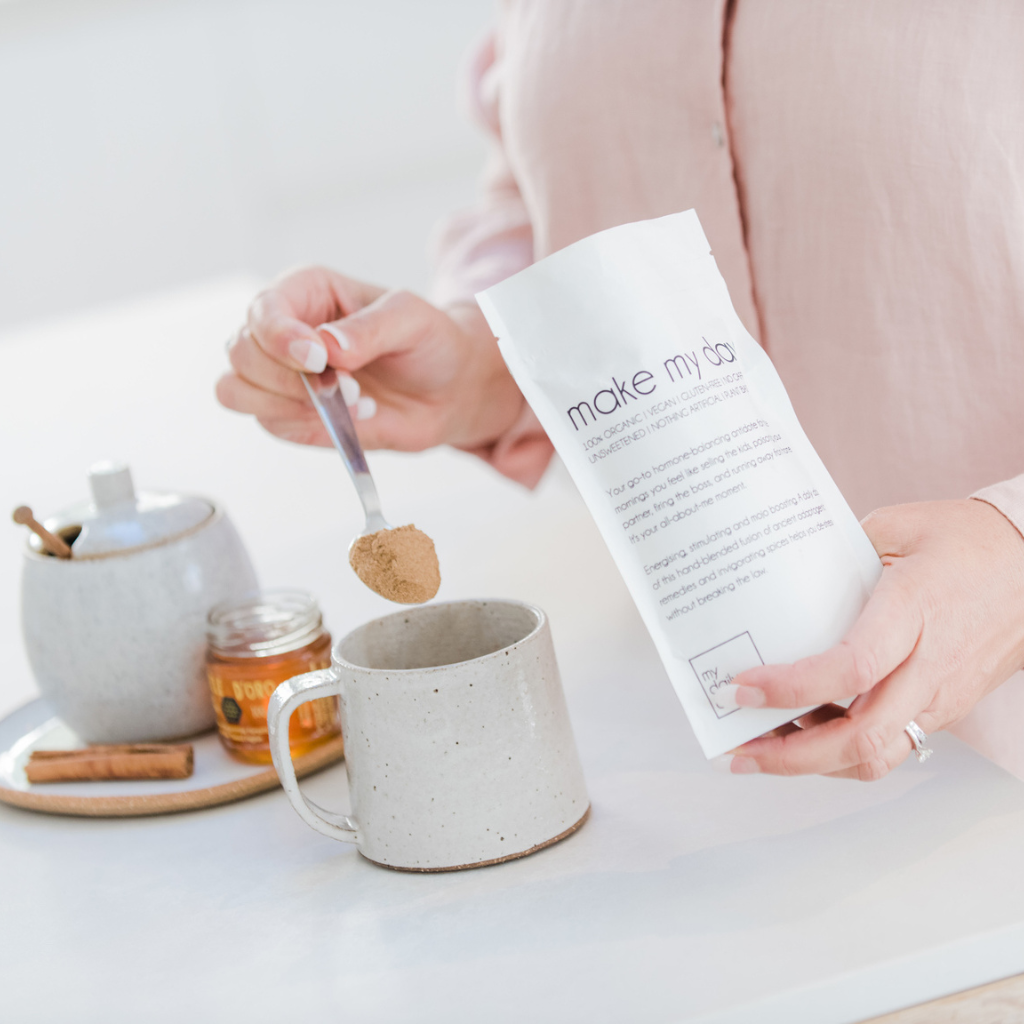 Where I share tips, habits and tools to support your journey through menopause and beyond. Receive a copy of my upcoming book (still a secret), when you order your first pouch of our Make My Day, Pick Me Up or tuck Me In blends.